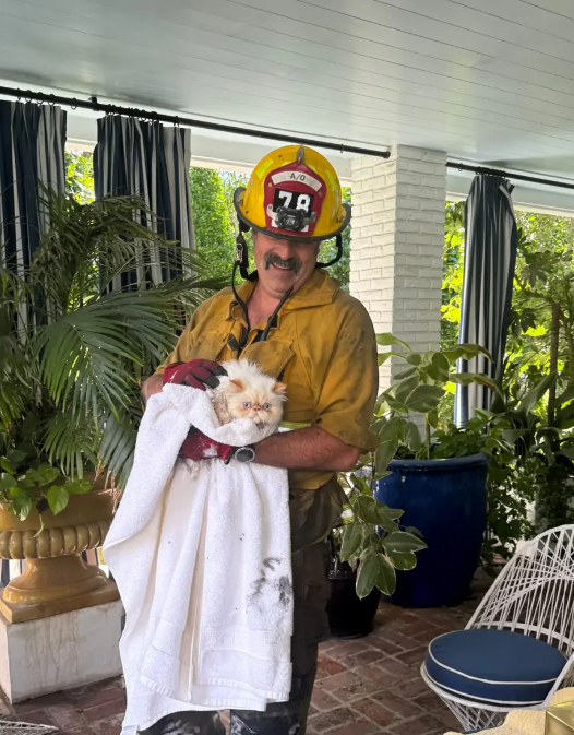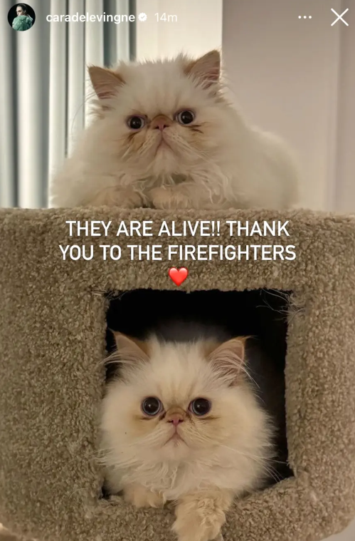 Another Instagram story showed her two cats being carried out of her burning home by firefighters. "They are alive!!," she clarified.