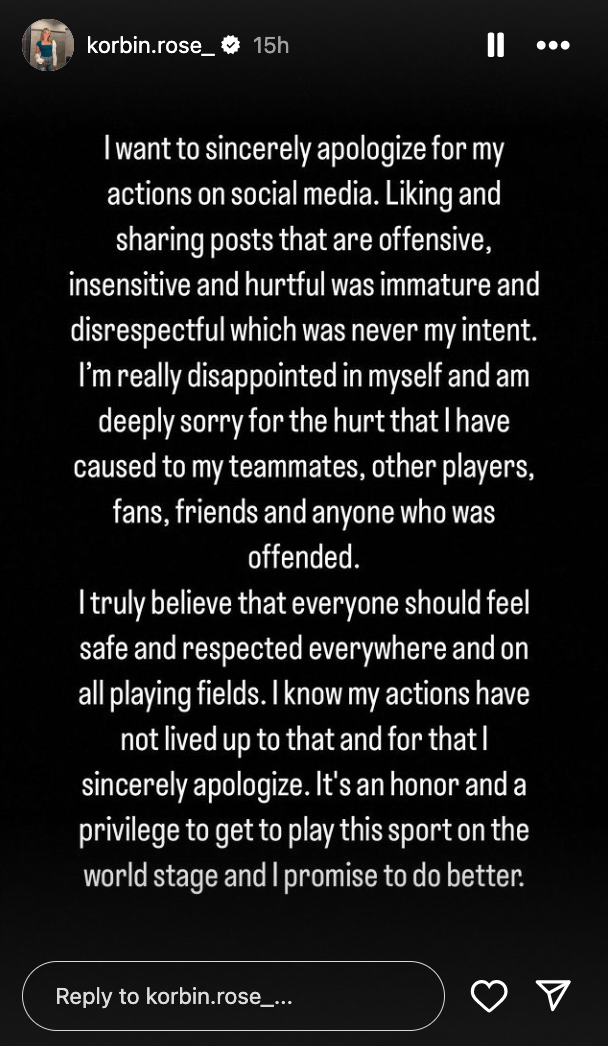 "I truly believe that everyone should feel safe and respected everywhere and on all playing fields. I know my actions have not lived up to that and for that I sincerely apologise. It’s an honour and a privilege to get to play this sport on the world stage and I promise to do better.”