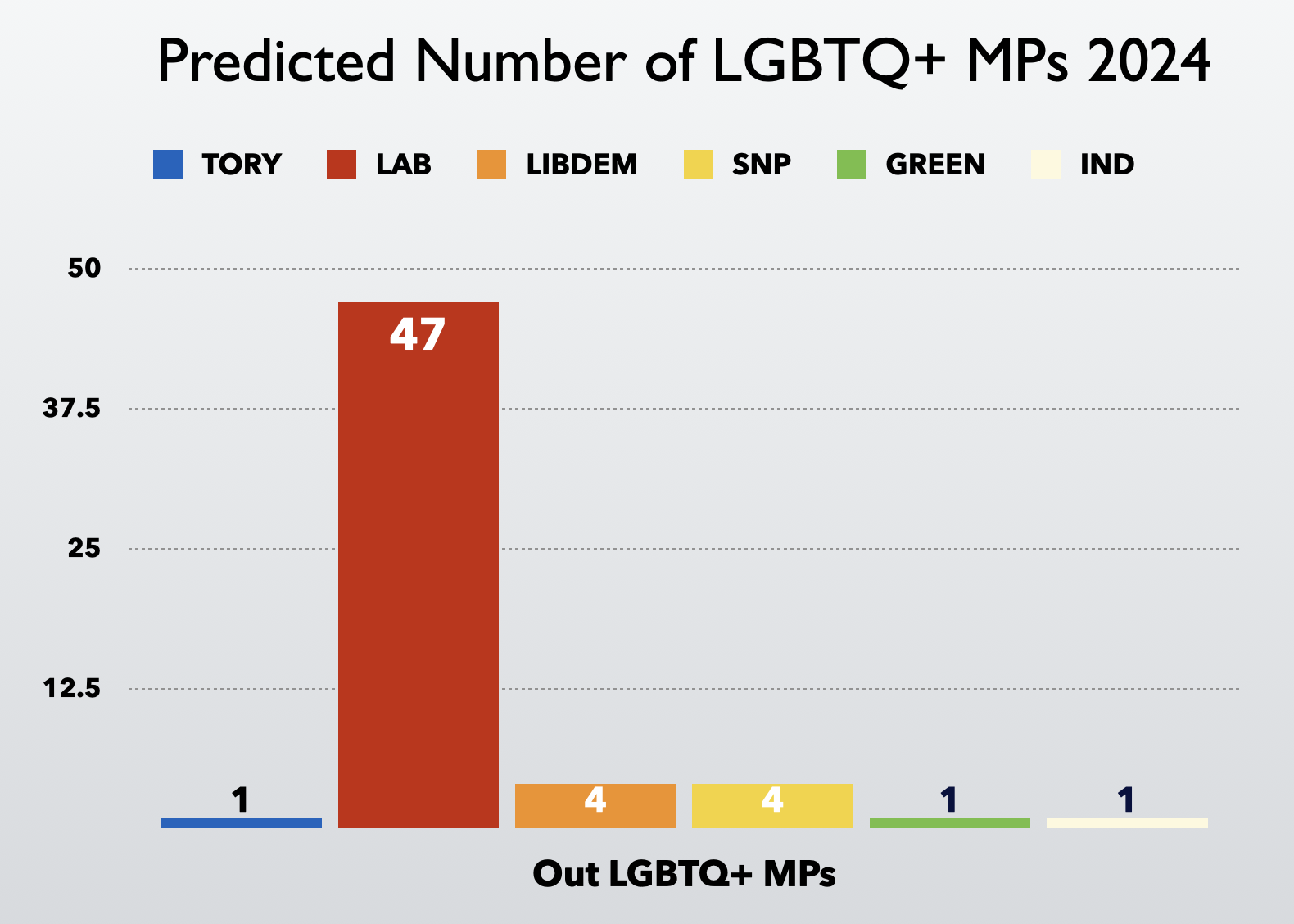 The Tory cohort will be decimated to no more than a handful of MPs - perhaps wiped out completely - while the Labour LGBTQ+ caucus could balloon to more than 40, possibly reaching as many as 49. This would be over four times the size of any other LGBTQ+ party caucus in the world.