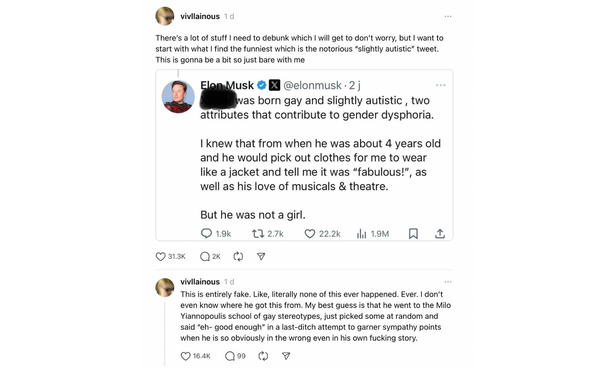 She was "born gay and slightly autistic" which were "two attributes that contribute to gender dysphoria" he added in a post on X. "I knew that from when he was about four years old and he would pick out clothes for me to wear, like a jacket and tell me it was 'fabulous', as well as his love of musicals and theatre. But he was not a girl."