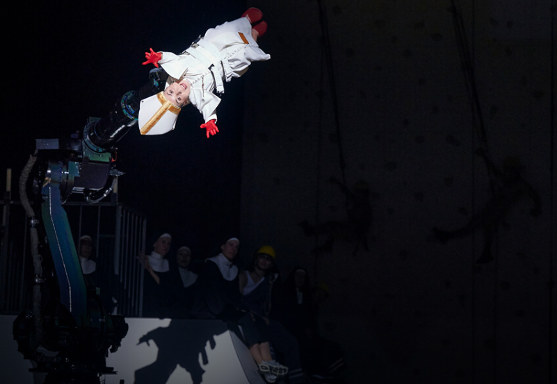 The opera - with an age rating of 18 and over - features an all-woman cast portraying nuns, who rip off their habits amid the "sensual, poetic and wild" performance. One scene sees an actress dressed as the Pope and being raised and spun around via a robotic arm, and another scene sees an actress singing tracks by Eminem while portraying Jesus.