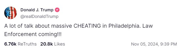 He wrote on the site , appearing to refer to the United States presidential election: "A lot of talk about massive cheating in Philadelphia. Law enforcement coming!!!"