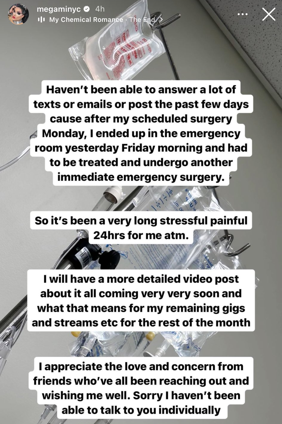 In an update posted on her X/Twitter profile on Saturday (14 December), Megami revealed that she had been in hospital for three days after requiring emergency surgery.
