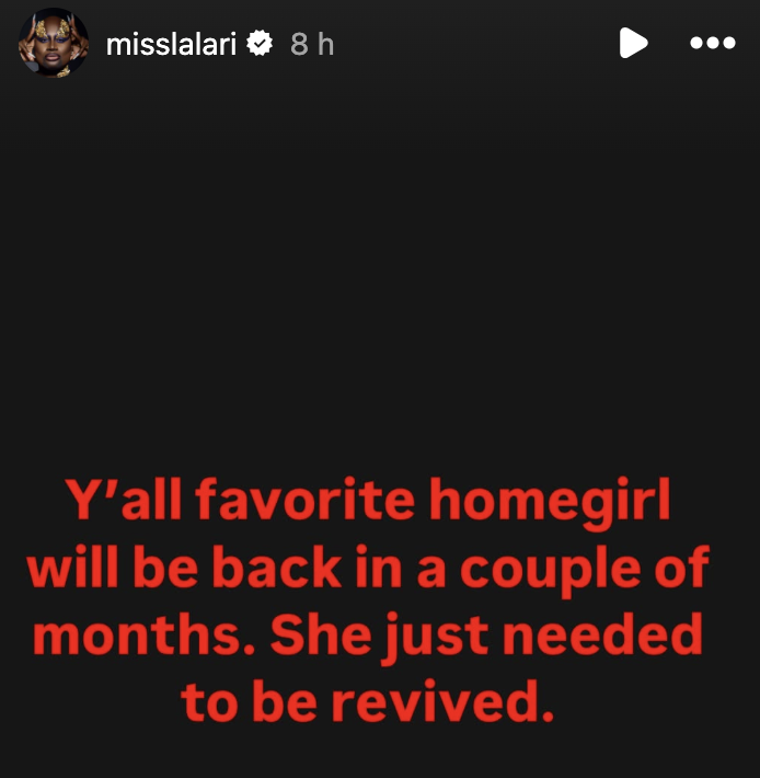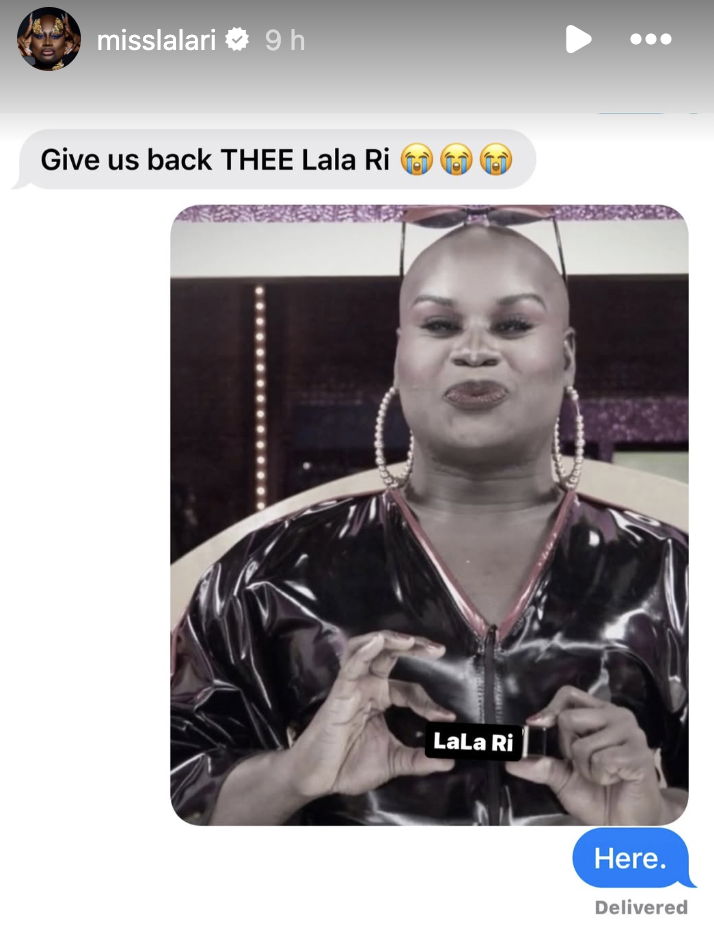 His Instagram Story was preceded by another meme, indicating that LaLa had 'eliminated herself' from drag via All Stars lipstick – but that "THEE LaLa Ri" is set to return.