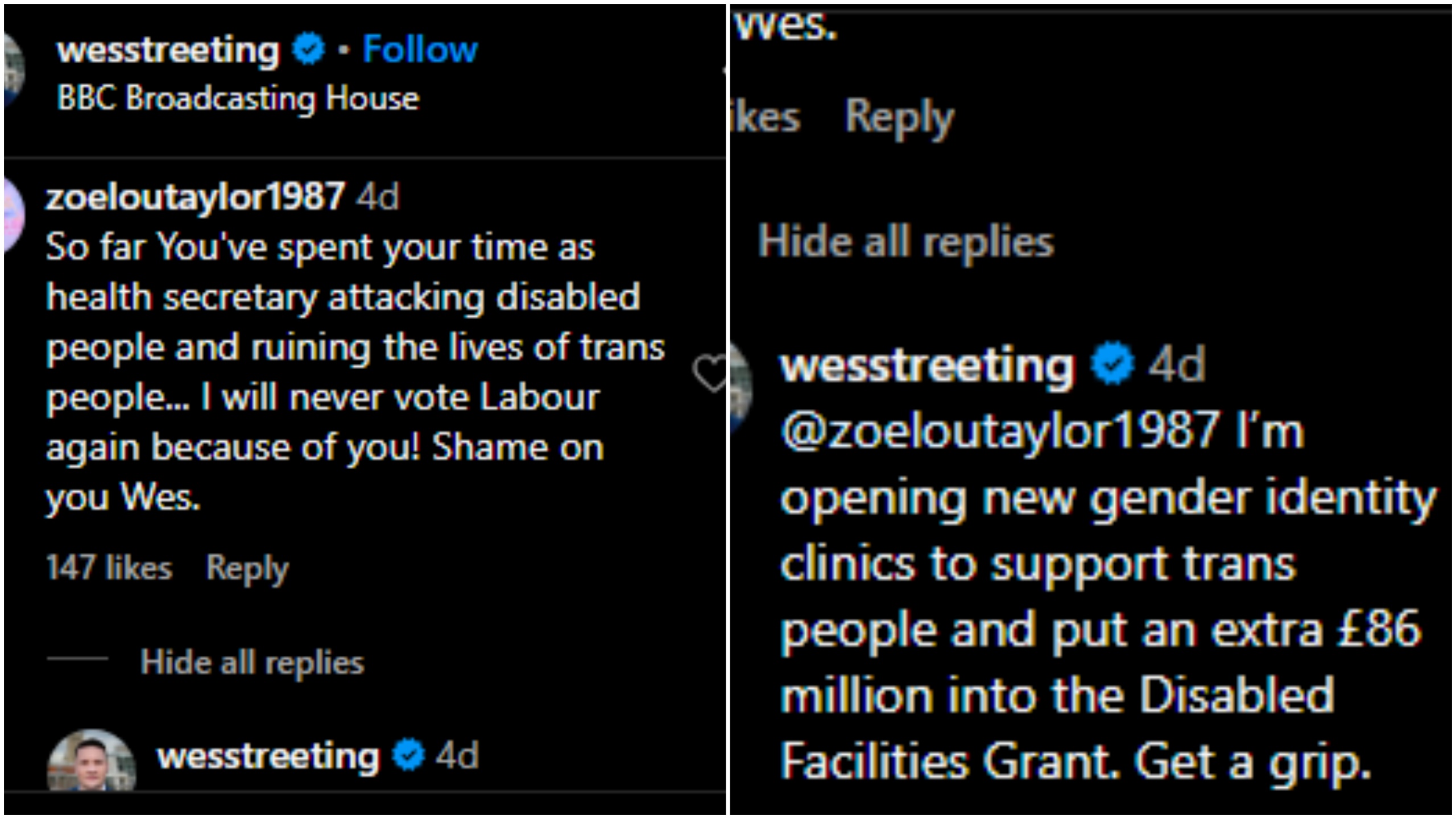 Streeting defended himself by saying the government was "opening new gender identity clinics to support trans people and putting an extra £86 million (more than $111 million) into the disabled facilities grants ", and told the member of the public to "get a grip".