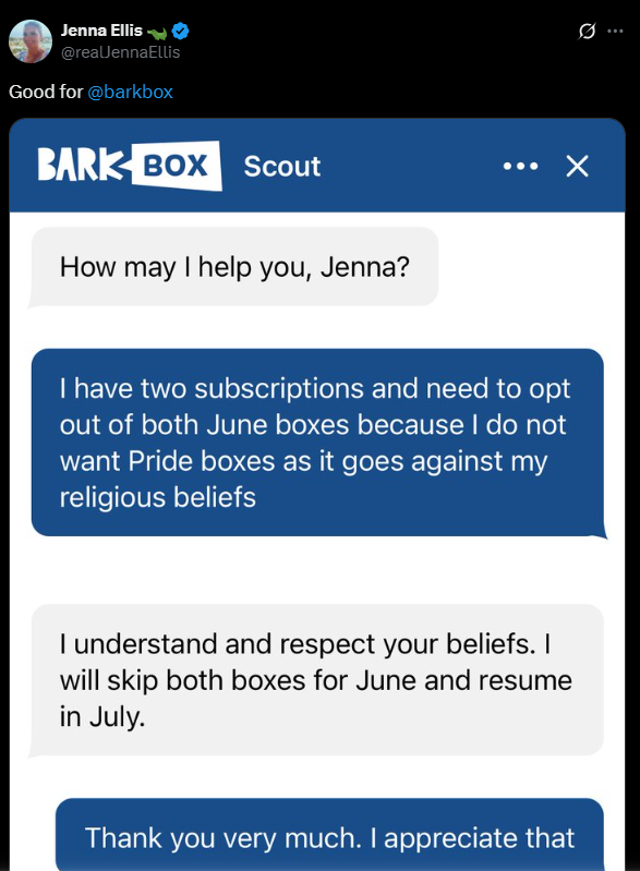 Ellis, who has over a million followers on X, now works as a senior policy adviser for the anti-LGBTQ+ American Family Association , and her X bio proclaims her to be "a servant of Jesus Christ." She recently shared a screenshot of a customer service chat in which she asked not to receive a BarkBox in June.