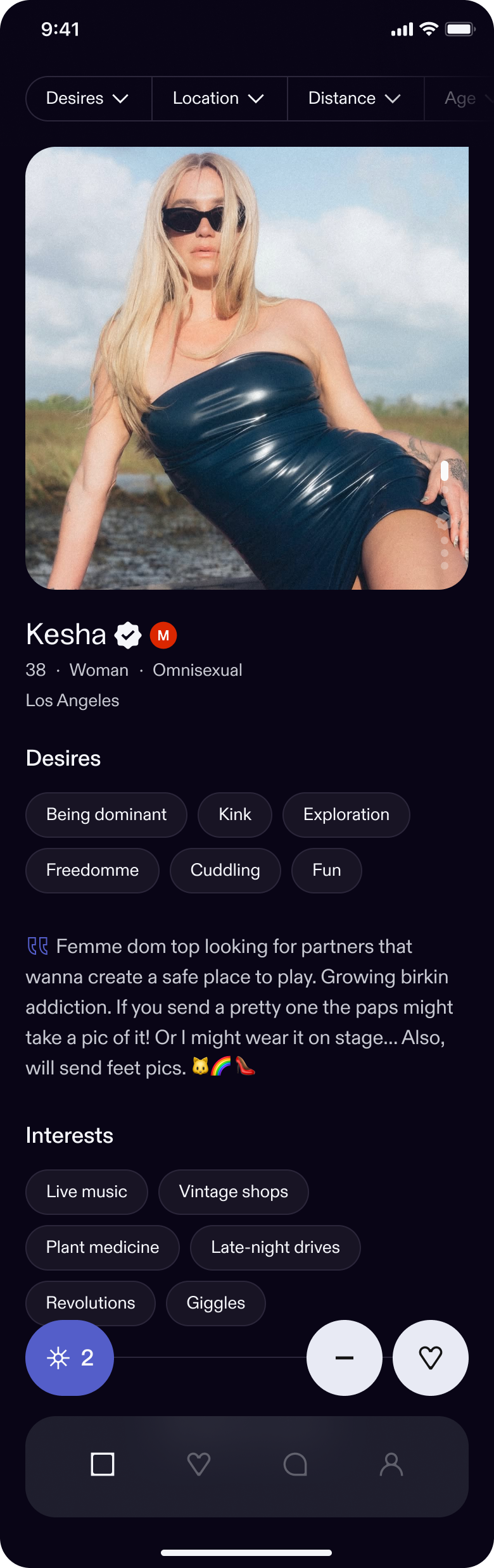 On dating app Feeld , "BOY CRAZY" hitmaker Kesha labels her sexuality as "omnisexual", as well as noting her interest in "being dominant" and "kink".