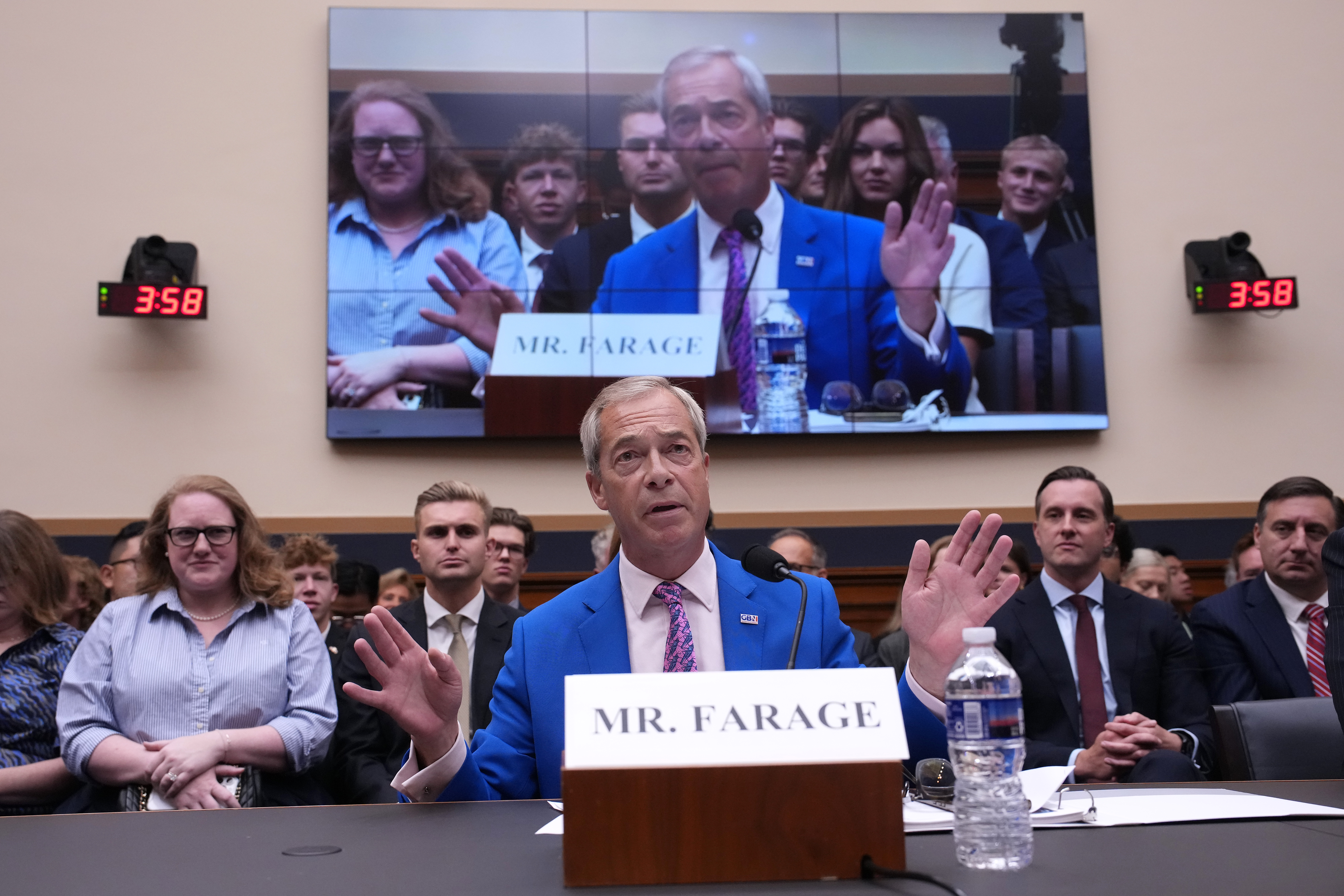 Nigel Farage was branded a “Putin-loving free speech imposter and Trump sycophant” by a US congressman during a congressional hearing on censorship in Washington DC.