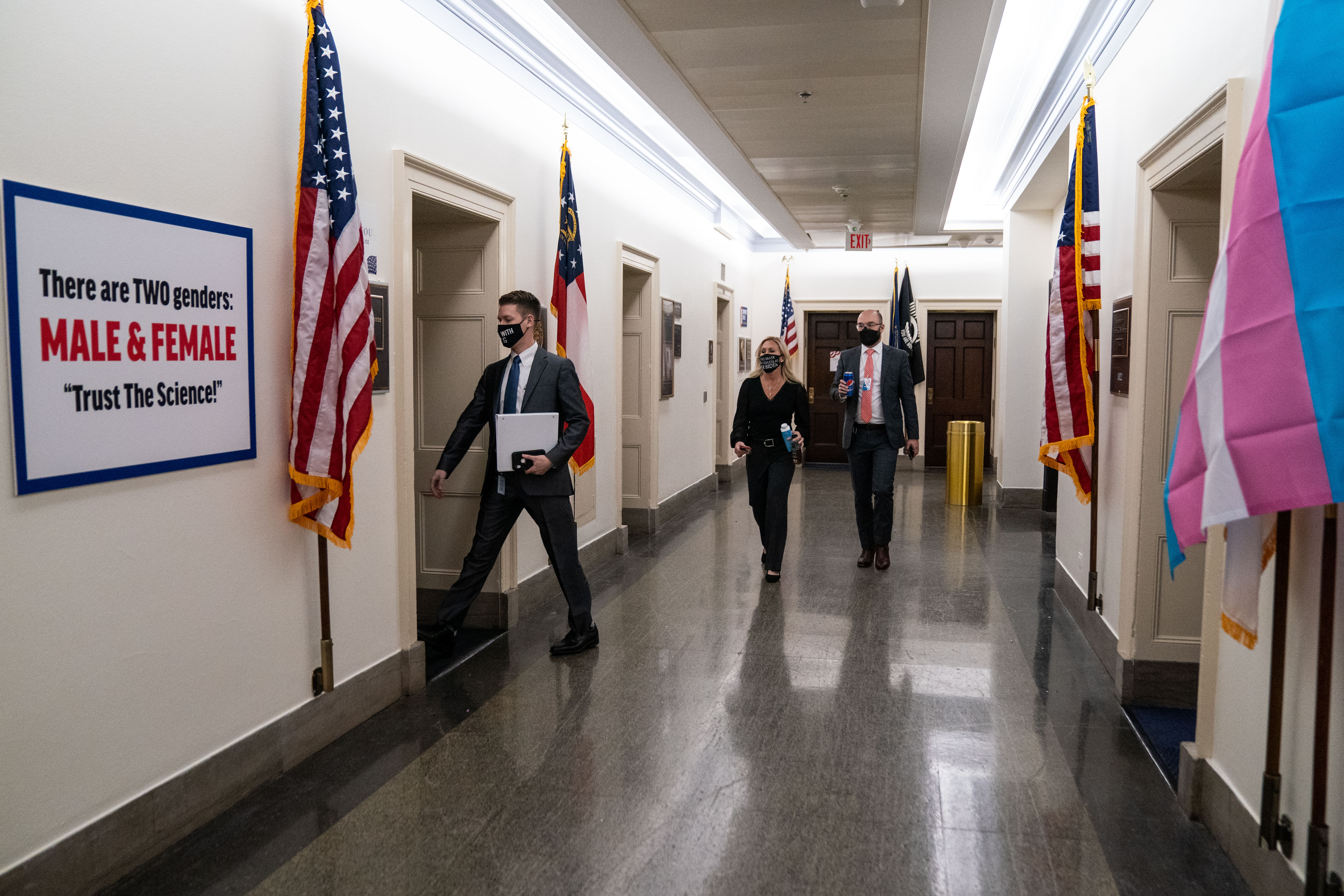 Newman hung a trans Pride flag outside her office in response to the anti-trans comments made by Greene in February 2021.
