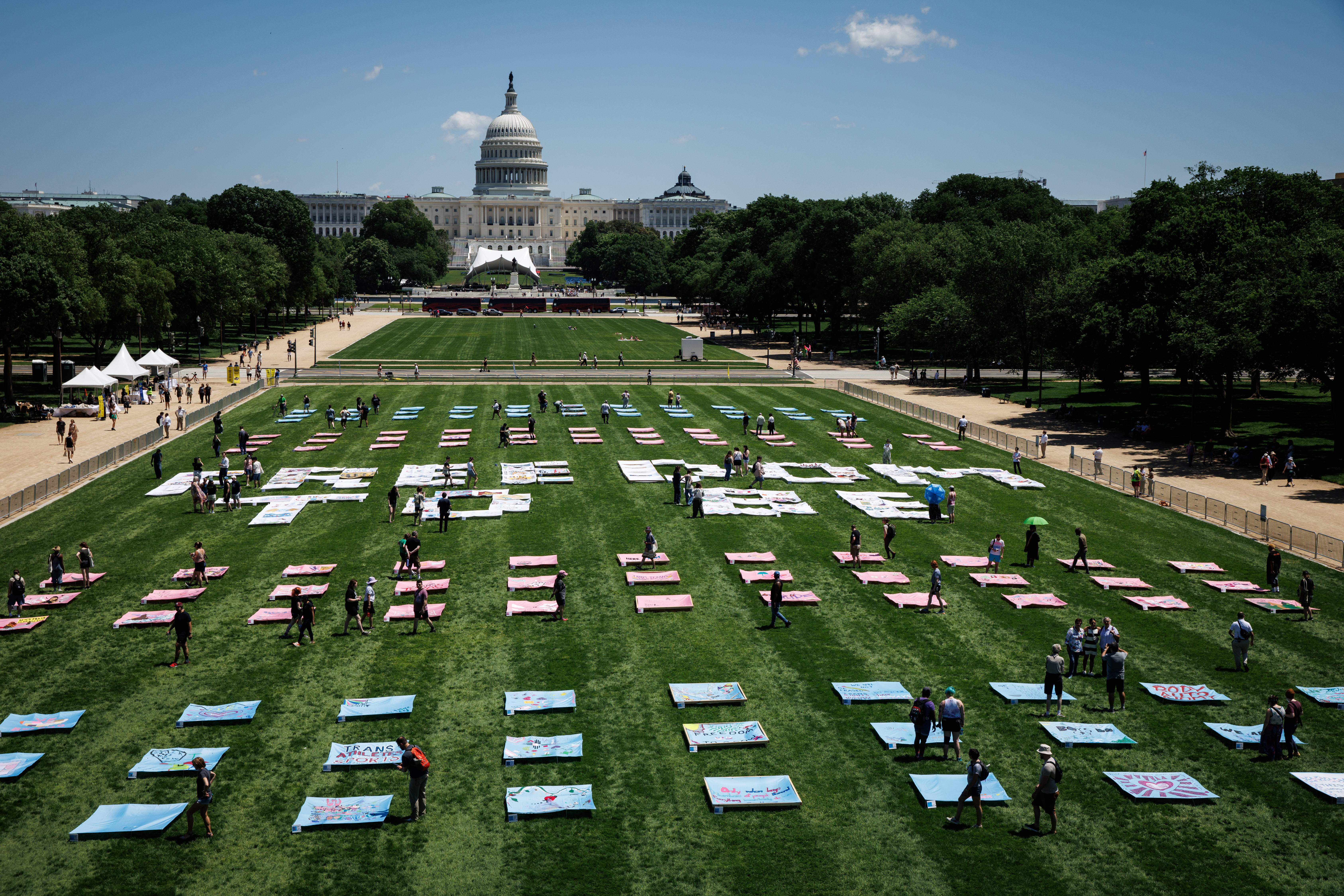 In May, a 9,000 square-foot set of quilts were laid outside the US Capitol Building in Washington, D.C. to highlight the plight of trans people across America in the face of increasing anti-trans hate and restrictive legislation.
