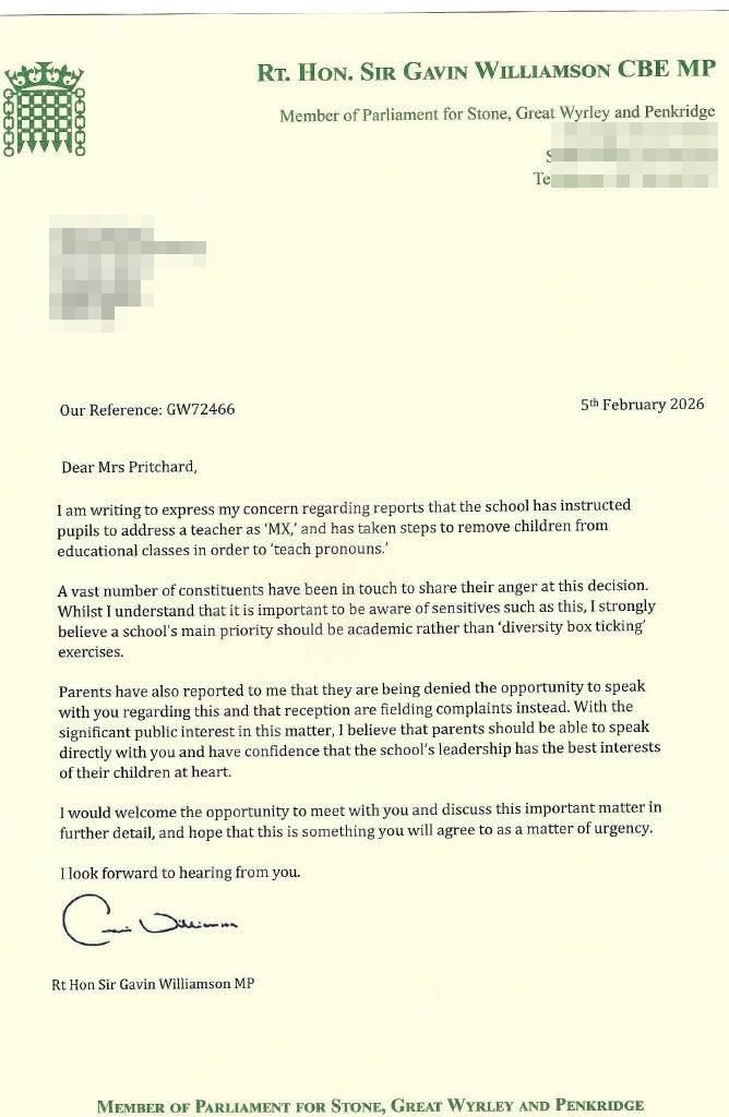 Following Robinson's video, the MP for the area – former Tory education secretary Gavin Williamson – publicly shared a letter he had addressed to the headteacher of the school in which he "express [his] concern" about the matter.