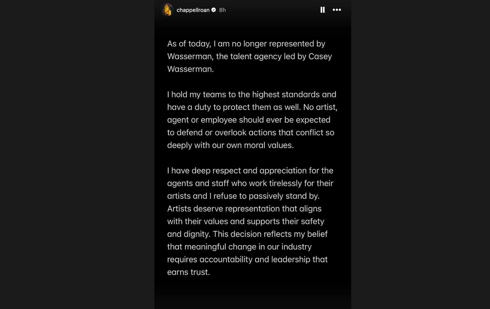 In her statement, Roan went on to say she has a "deep respect and appreciation" for agents who work "tirelessly" for their artists, adding: "I refuse to passively stand by."