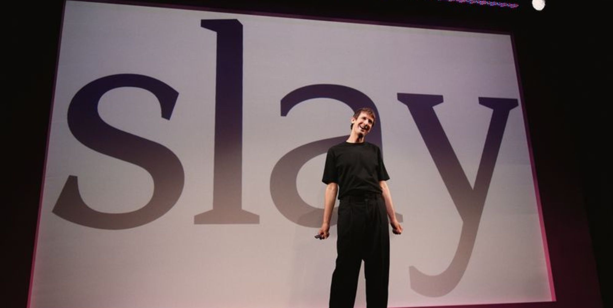 Try explaining it to a friend and you’ll be met with a blank face. Take said friend to see the show, and said face will be wet with tears of laughter, then proper tears, then joyful tears again. The PowerPoint flashes with words that guide and contradict Sharp’s stories; stories of being gay-bashed on a subway train by a fossilised European woman, of accidentally getting "a weenie massage", of nearly dying in the Mexican sea in 2024. He has "memorised, like, psychotically" every slide. "We're sort of treating PowerPoint like it's a drum kit. It's all rhythmic."