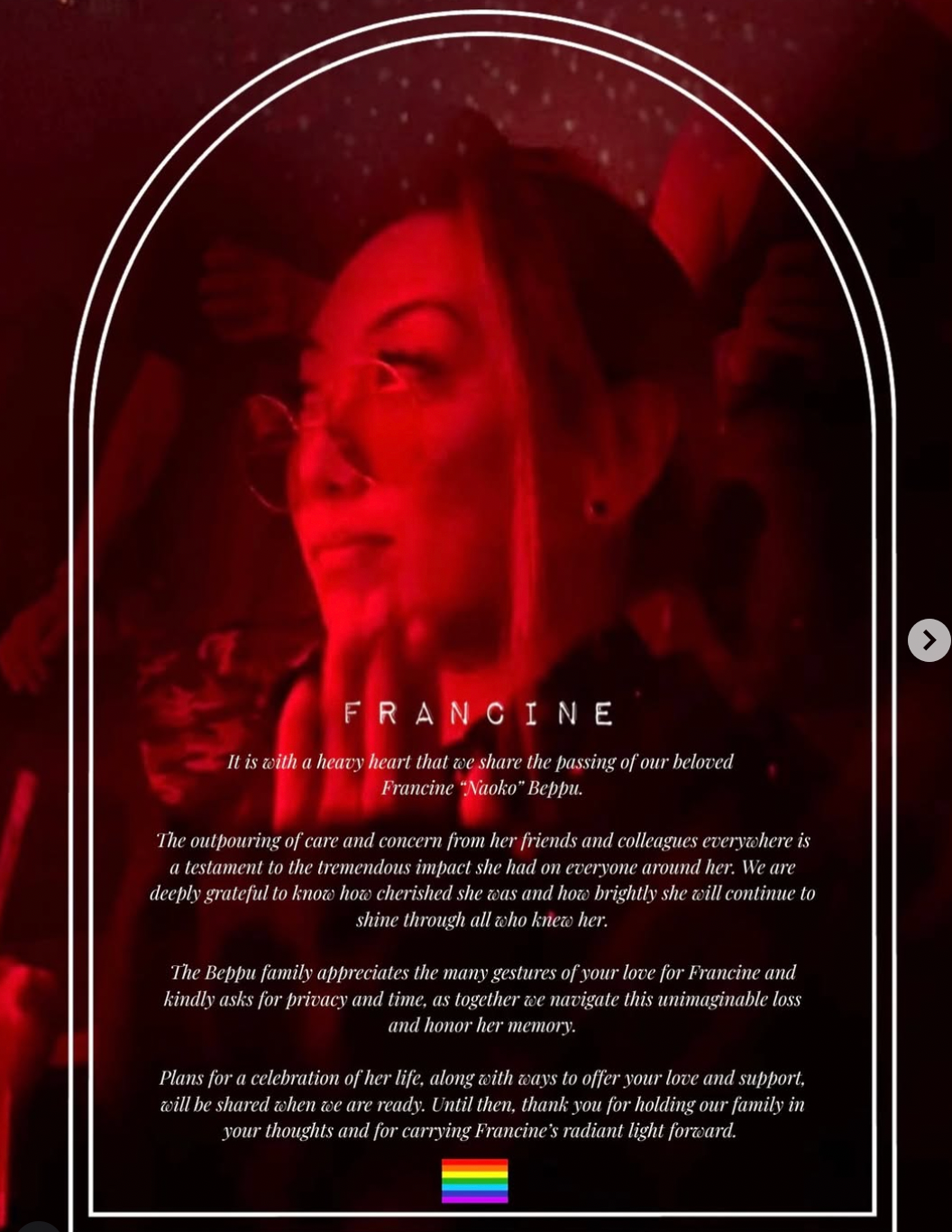 "It is with a heavy heart that we share the passing of our beloved Francine ‘Naoko’ Beppu," her loved ones shared in their statement.