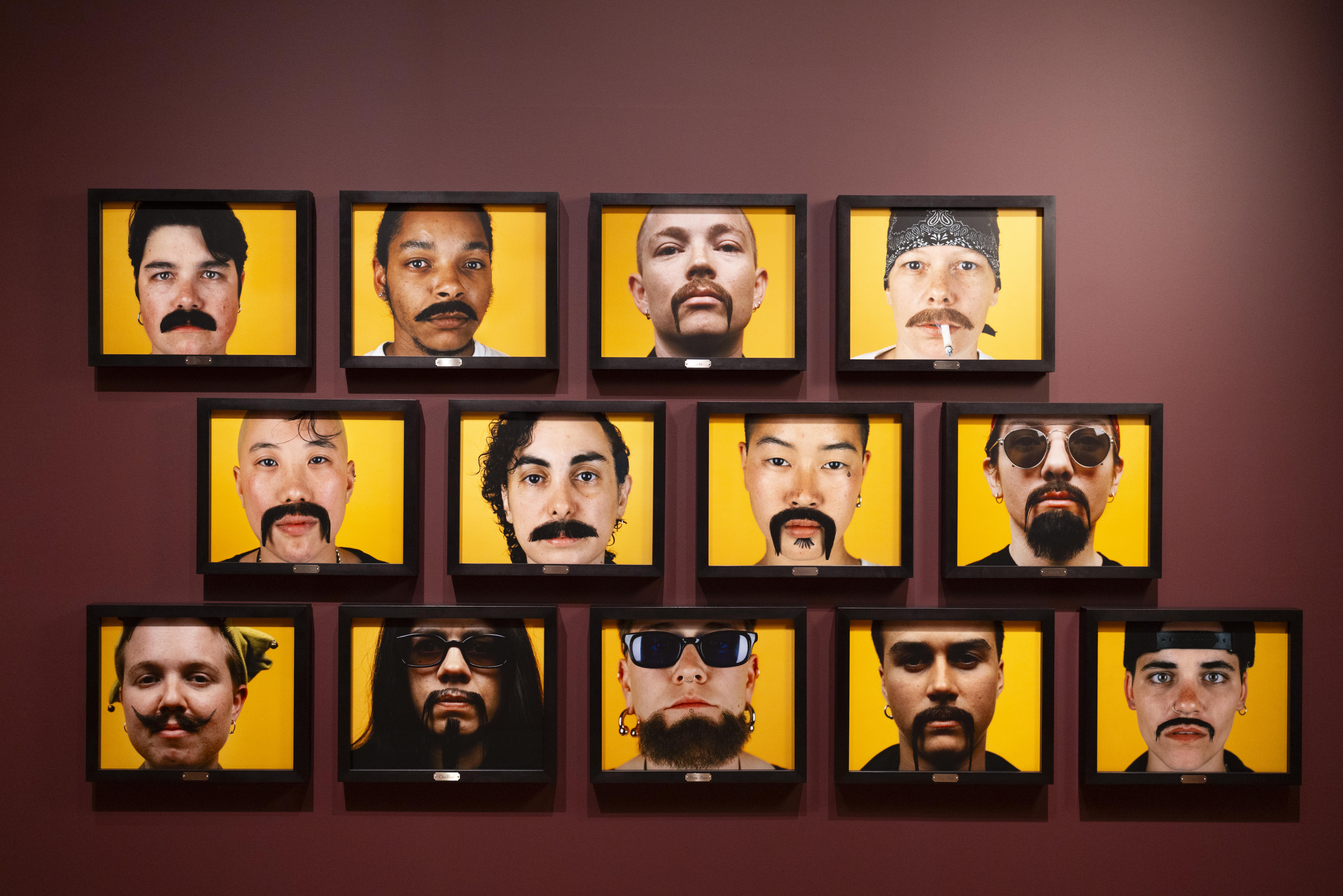 From a distance the images could be mistaken to be of cis men but as you approach clues and details – purposefully included and made visible by Opie – can be identified, such as the webbing of the facial hair’s glue. In this way, the images come to be revealed to represent a performance of gender identity and masculinity that seeks to make us, the viewer, question our own conceptions of what it constitutes and how we navigate that.